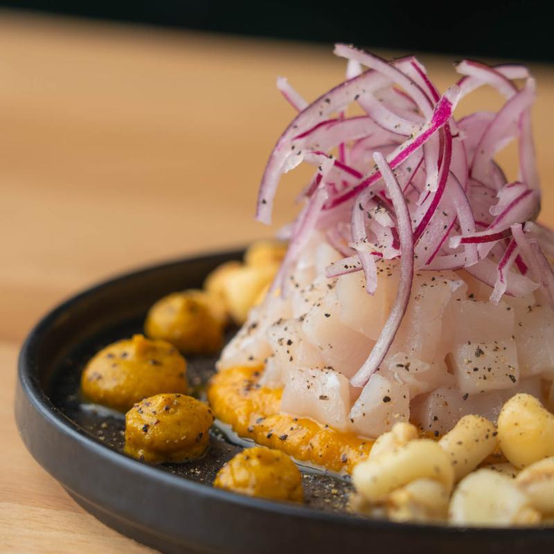 Fresh white fish diced with lime, salt, cilantro & citrus infused in leche de tigre, coconut milk on top of sweet potato purée, ají amarillo, fresh red onions, served with maíz mote pelado & canchita style corn and a side of crispy plantains.