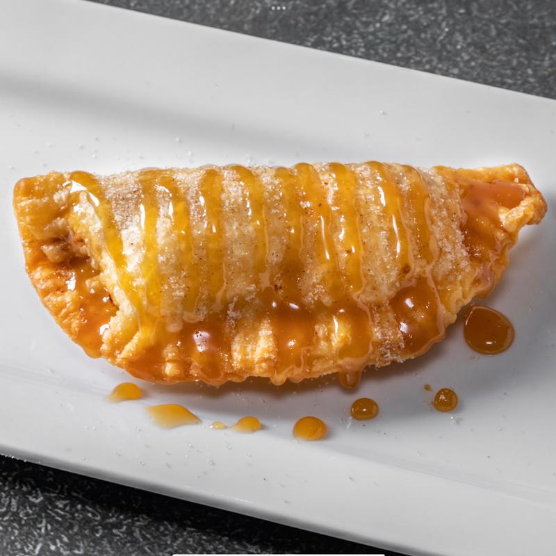 Turnover filled with a sweet planatain and queso fresco deep fried and dusted with sugar & cinnamon drizzled with caramel sauce.